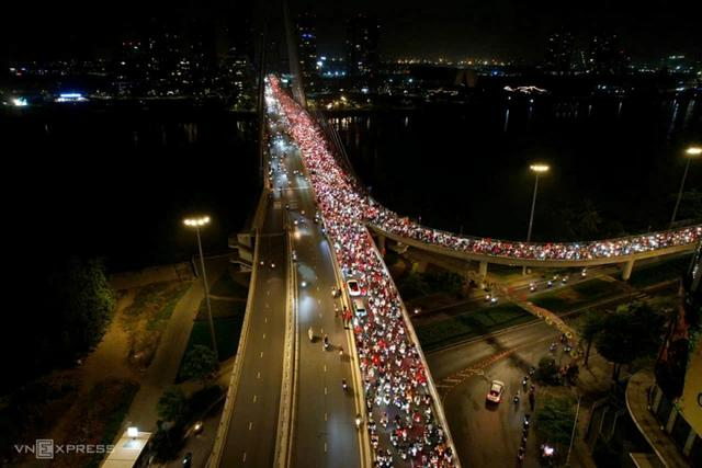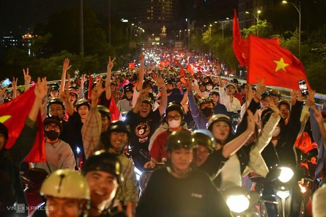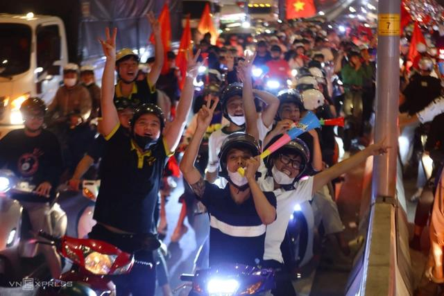 在胡志明市巴山桥桥头,大批球迷挥手庆祝越南队的胜利。