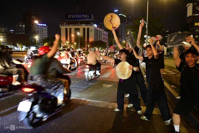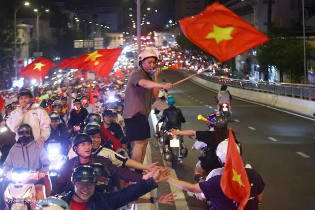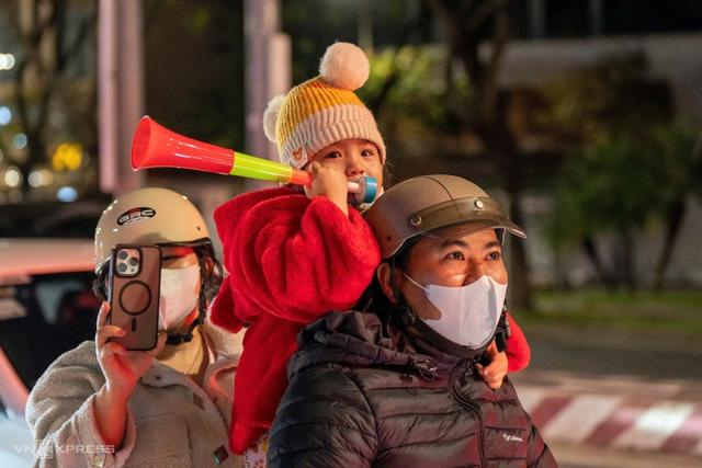 尽管河内气温降至摄氏8-10度,但仍有许多人涌上街头,挥舞着旗帜,欢呼庆祝越南U23队的胜利。通往金莲隧道的数百米长的道路,整条路都被车灯和旗帜的红色光芒照亮。街道上回荡着震耳欲聋的欢呼声。越南队在与韩国队的激烈点球大战中获胜,球迷们欢呼雀跃。