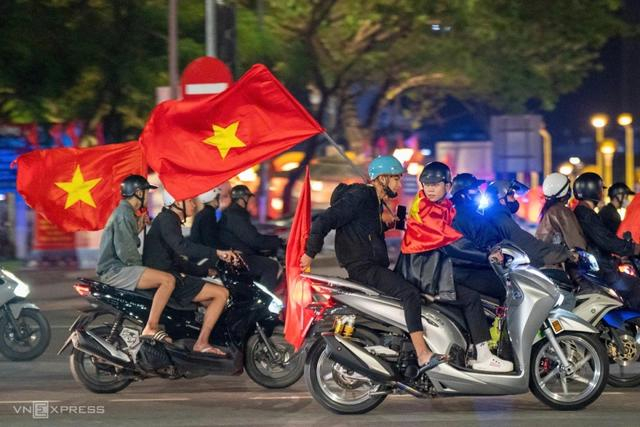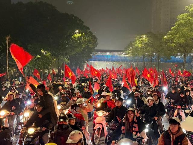 尽管河内气温降至摄氏8-10度,但仍有许多人涌上街头,挥舞着旗帜,欢呼庆祝越南U23队的胜利。通往金莲隧道的数百米长的道路,整条路都被车灯和旗帜的红色光芒照亮。街道上回荡着震耳欲聋的欢呼声。越南队在与韩国队的激烈点球大战中获胜,球迷们欢呼雀跃。