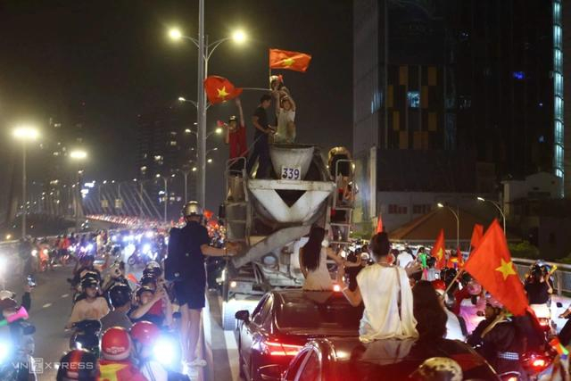 在胡志明市巴山桥桥头,大批球迷挥手庆祝越南队的胜利。